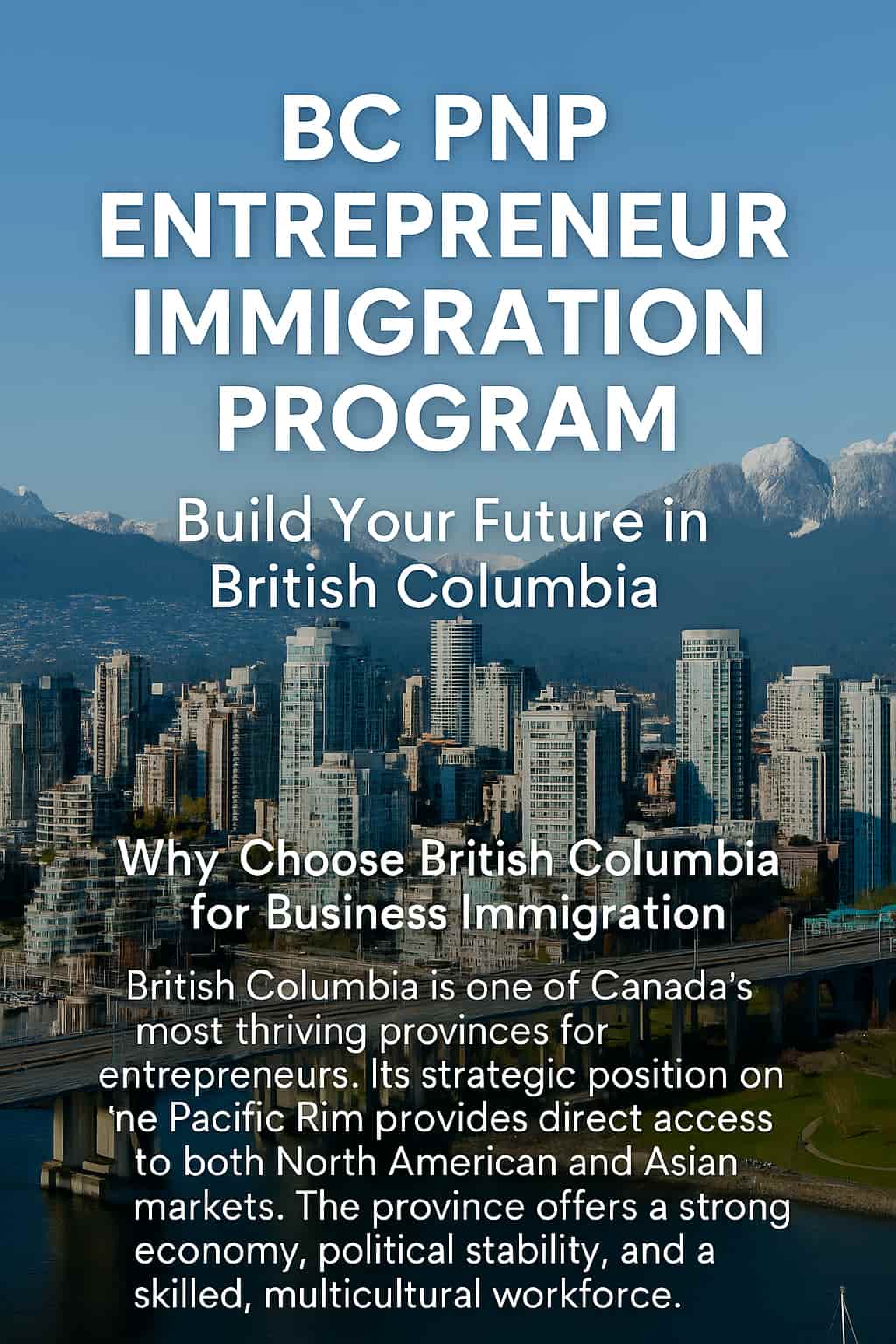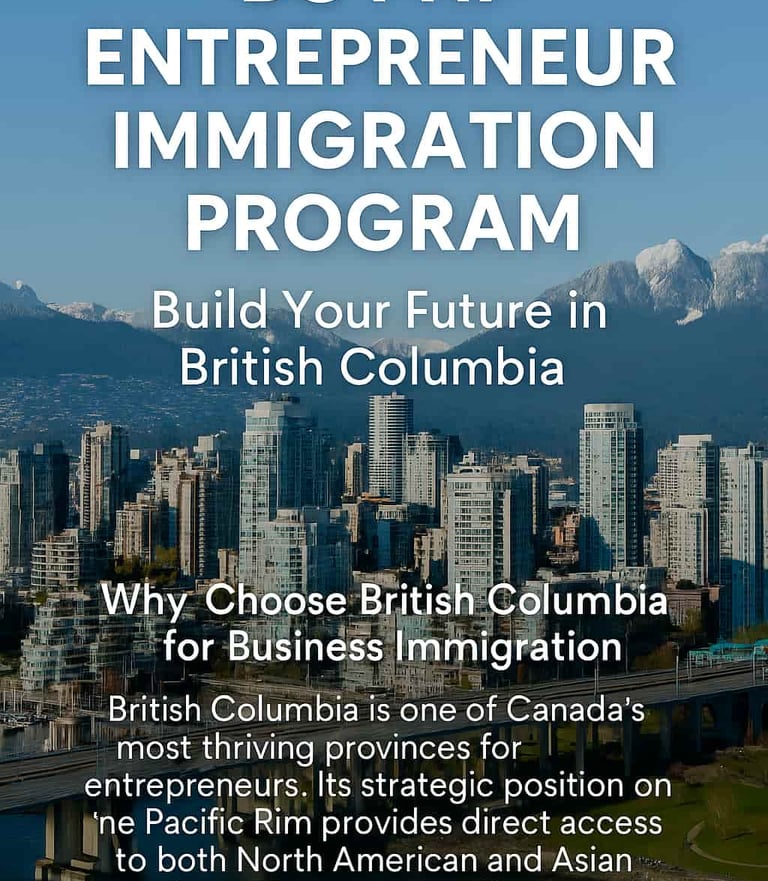 Are you an entrepreneur ready to turn your business vision into reality in Canada? The British Columbia Provincial Nominee Program (BC PNP) Entrepreneur Immigration stream is one of Canada’s most attractive pathways for international investors and business owners who want to establish or purchase a business in British Columbia. It’s designed for individuals who are ready to contribute to B.C.’s economy while taking an active role in management and operations — and ultimately, to build a new life in Canada.